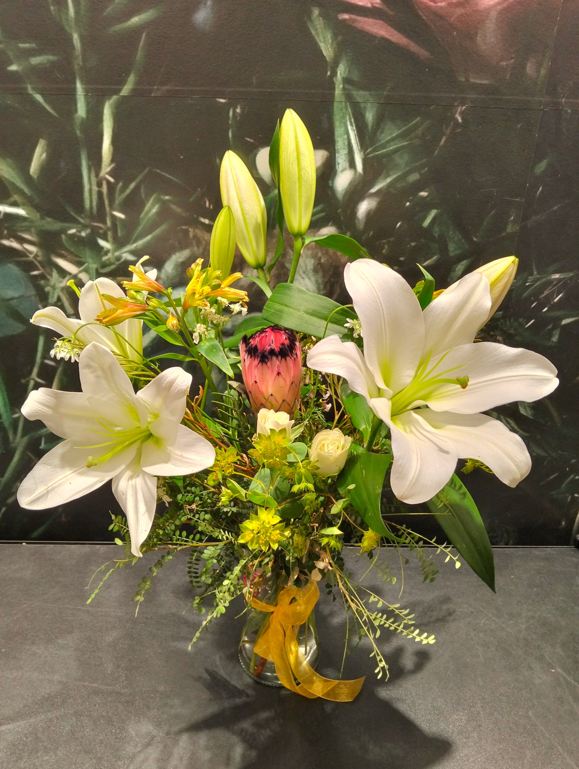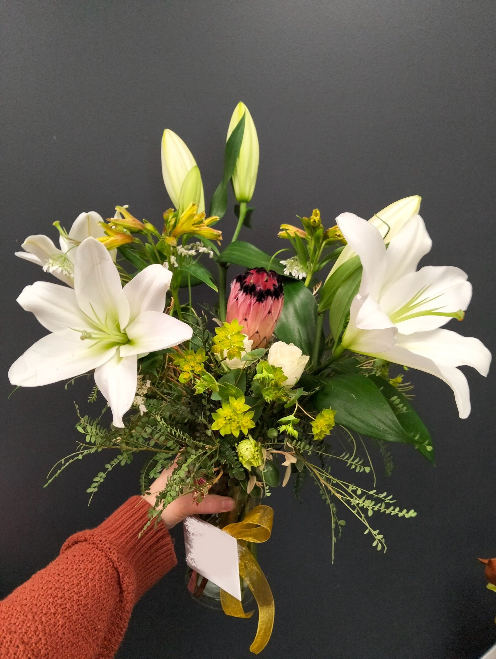 A lush, colourful mix of blooms in a large glass vase that can be enjoyed again. Also helpful if you know that they don't have to worry about finding a vase.