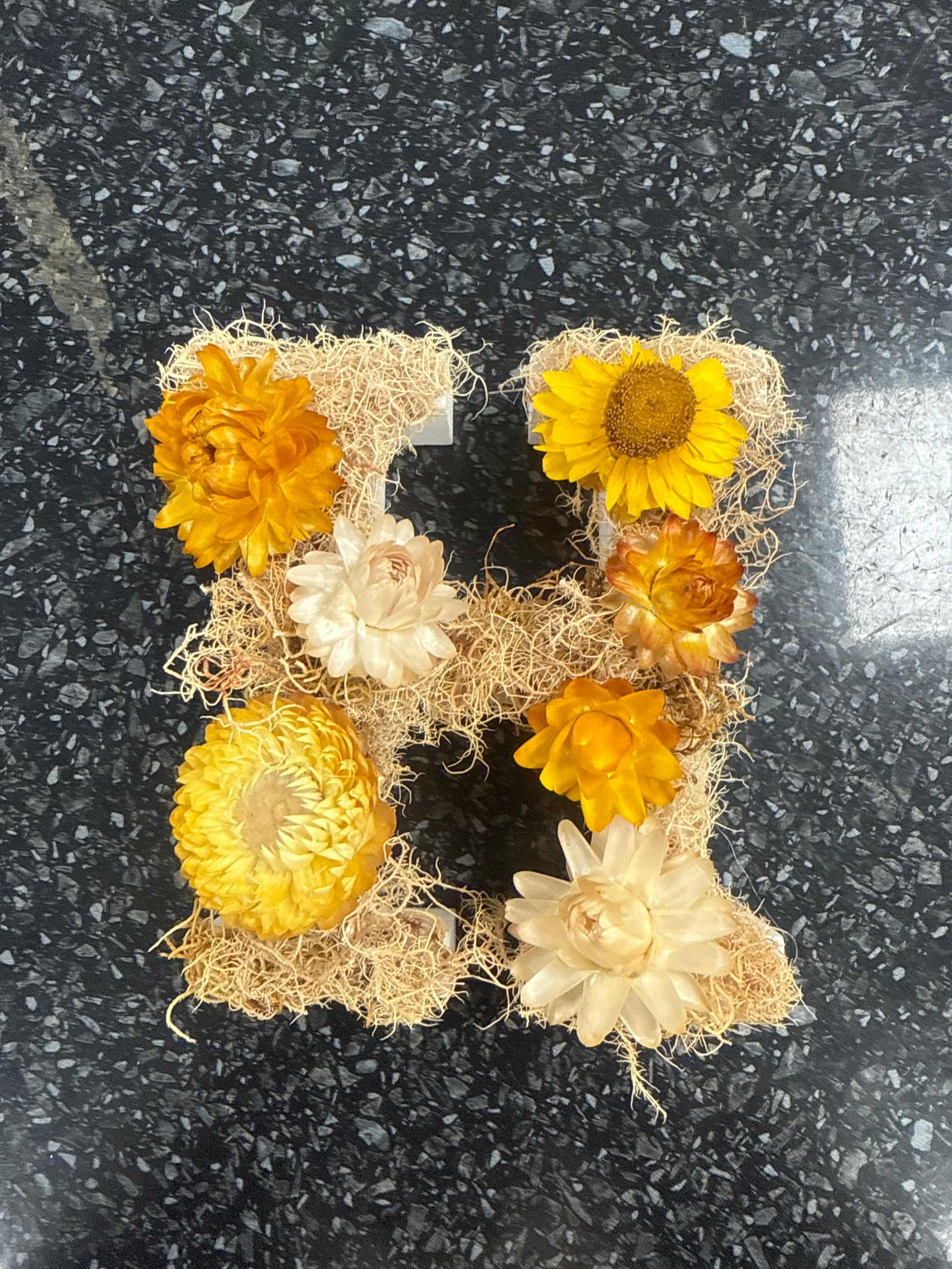 Add a touch of natural charm to your décor with this beautifully handcrafted dried flower arrangement. Featuring a selection of preserved yellow and ivory blooms artistically arranged on a letter-shaped base, this piece is perfect for home styling, gifting, or wedding décor. Each design is unique, made with care by our florist using high-quality dried flowers to ensure long-lasting beauty.